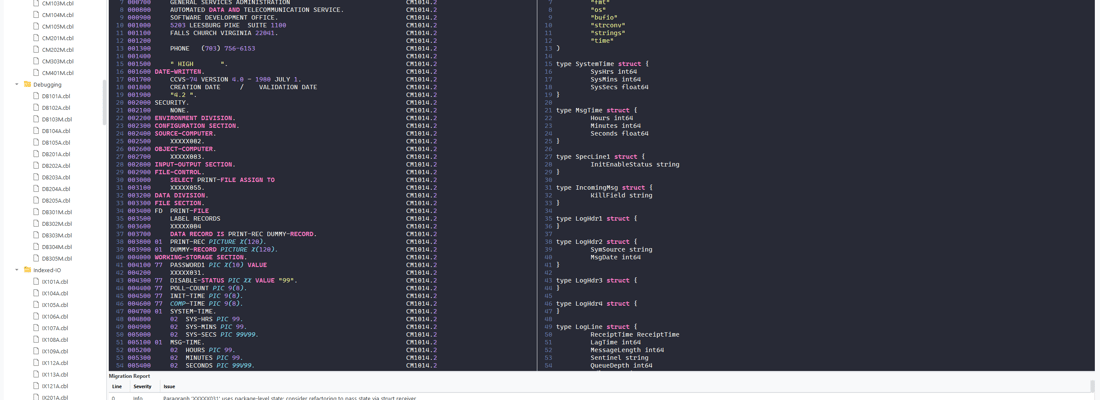 Go is a practical target for COBOL migration when simplicity, fast compilation, and easy deployment matter. My COBOL to Go migration tool uses a full compiler pipeline to convert COBOL source into Go with package-based structure, typed structs with exported fields, sized integers (int16, int32, int64), and bufio-based file I/O. The result is straightforward Go code that compiles to a single binary and runs on any platform.